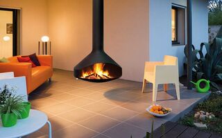 Créé en 1968 par Dominique Imbert, cette cheminée centrale, révolutionnaire tant par son dessin que par sa conception technique, est le premier en date (dans le monde) de la lignée des foyers suspendus et pivotants à 360°.